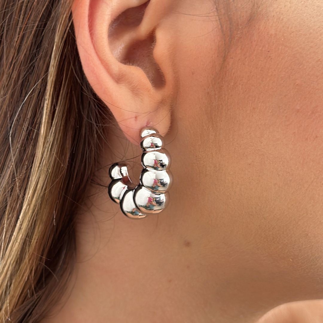 Meia Argola Clássica com Toque Moderno: A forma meia argola oferece uma base clássica, enquanto as várias bolinhas ao longo da extensão adicionam uma dimensão moderna e texturizada.